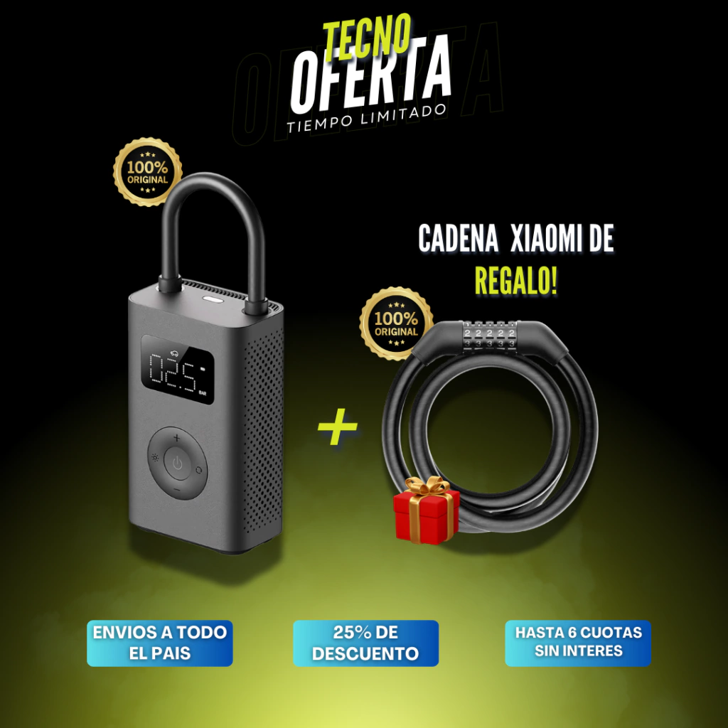 Este combo exclusivo combina el Compresor de aire Xiaomi Electric Air Compressor 2, un dispositivo de última generación para inflado rápido y eficiente, con un Candado Xiaomi de alta seguridad, ideal para proteger tu patinete eléctrico o bicicleta. ¡Todo lo que necesitas para mantener tus vehículos en perfecto estado y seguros!
